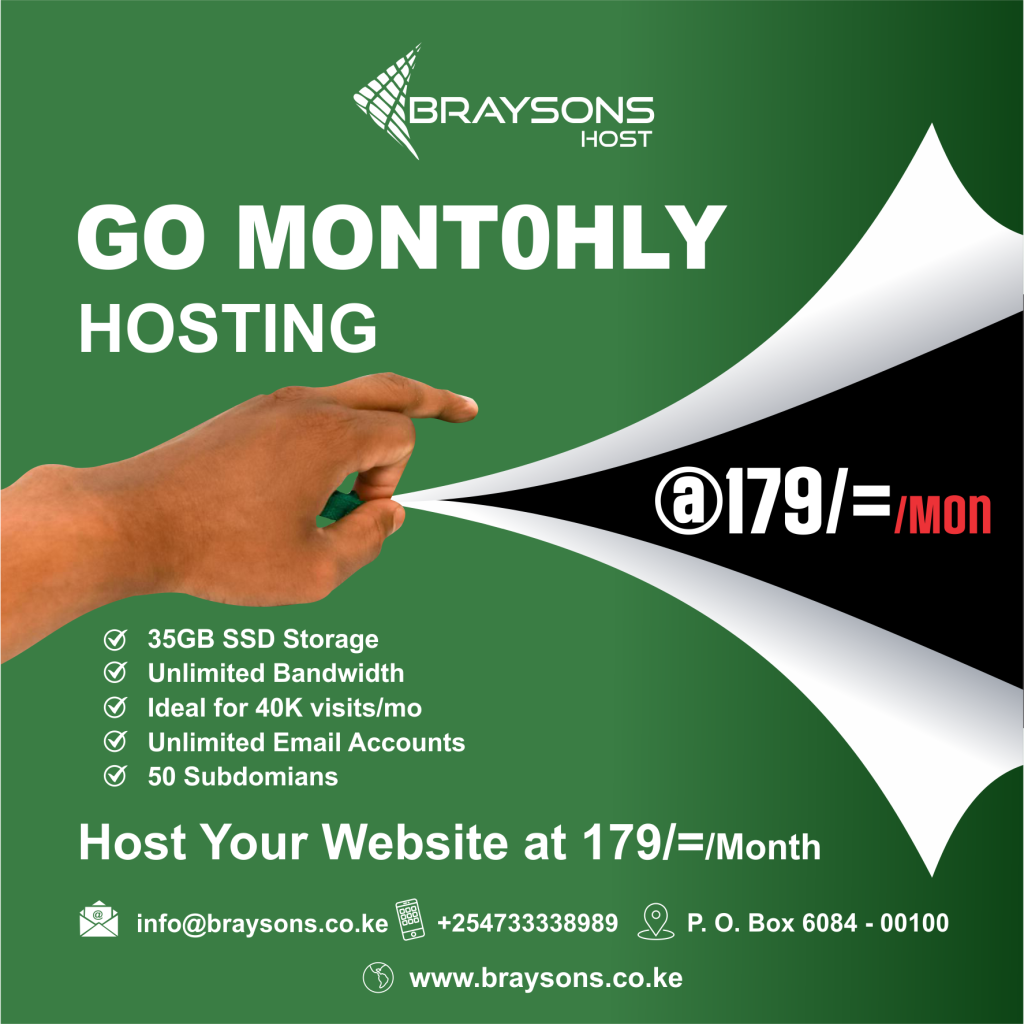 Are you looking for a reliable, fast, and affordable hosting solution without the burden of annual payments? Look no further! At Braysons Host, we bring you flexible Monthly Hosting Packages designed to give your website the performance and scalability it deserves – all at just Ksh 179 per month!